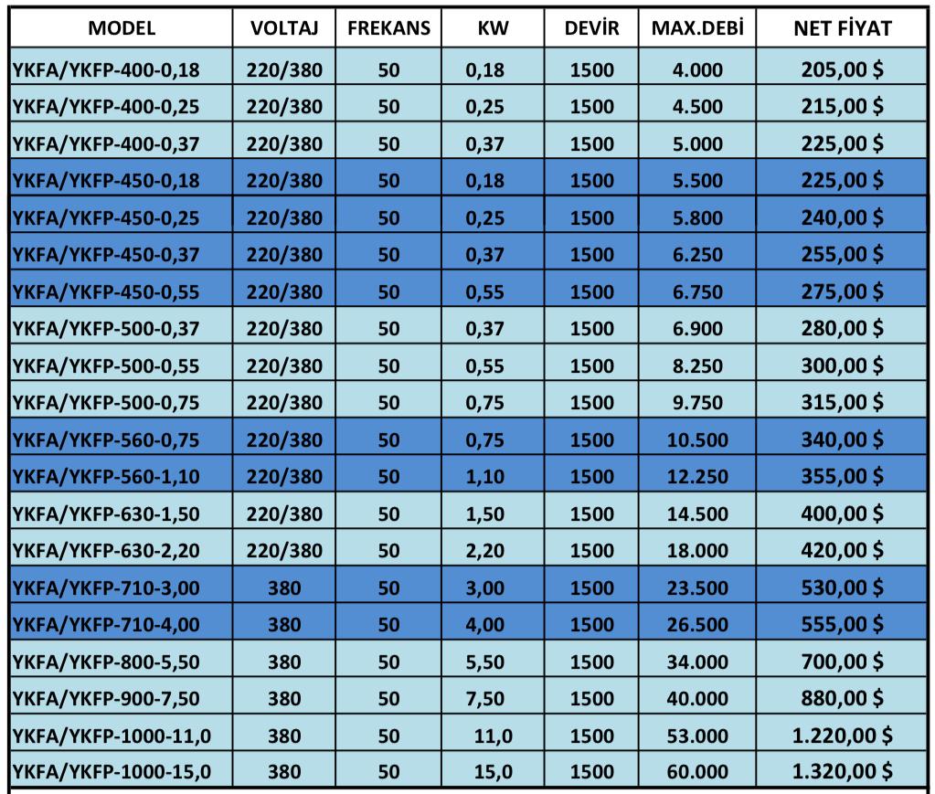 Yüksek hava debileri ve yüksek basınç kayıplarını karşılayabilen bu aksiyel fanların pervaneleri ALÜMİNYUM hammaddedendir. Kanat açıları ayarlanarak debi ve basınç değişimi yapılabilme şansı sağlarlar.